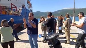 Οι Κεφαλλονίτες «σπρώχνουν» συμβολικά το φορτηγό πλοίο, για να απομακρυνθεί από το λιμάνι…