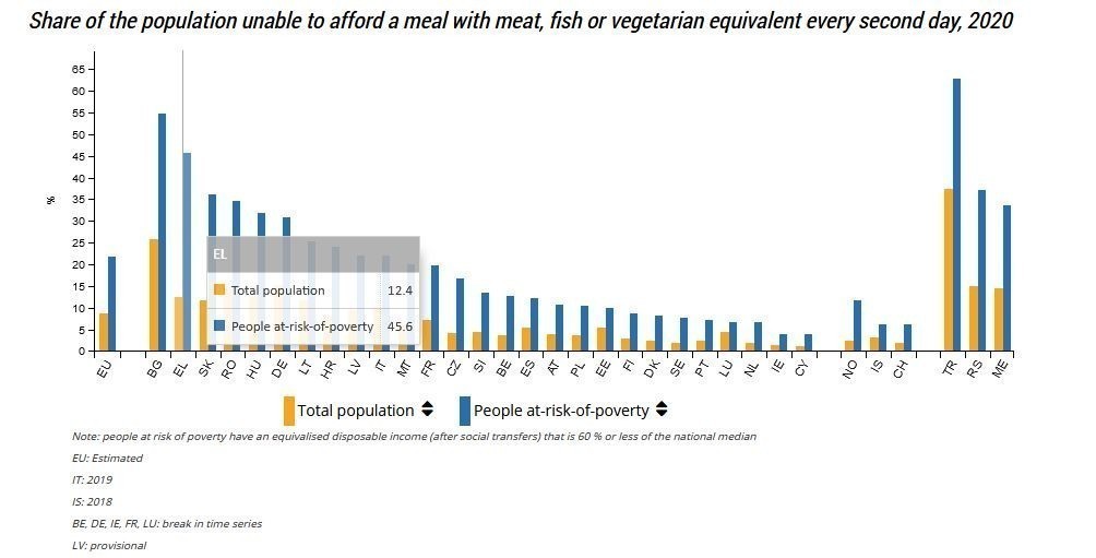 Το υψηλότερο ποσοστό των ατόμων που κινδυνεύουν από τη φτώχεια και δεν έχουν τα οικονομικά μέσα για να εξασφαλίσουν ένα γεύμα με κρέας, ψάρι ή άλλο ισοδύναμο καταγράφηκε στη Βουλγαρία (54,6%), ακολουθεί η Ελλάδα (45,6%) και τη Σλοβακία (36,0%).