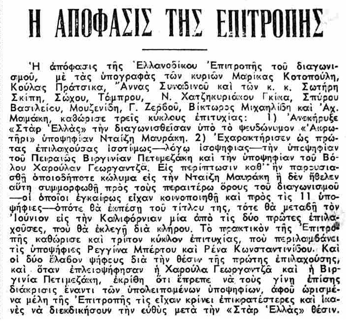 Με τα πολλά βγήκε η απόφαση και τον τίτλο κέρδισε η Κρητικοπούλα Ντέζη Μαυράκη από τα Χανιά που αγωνίστηκε με το ψευδώνυμο «Ακρωτήρι» λόγω καταγωγής.